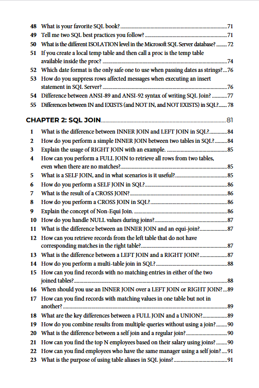 This book contains frequently asked questions and their answer/explanations on essential SQL topics. You can use this book to quickly revise all essential SQL concepts before your interview, both telephonic and face-to-face and you can also use this book to learn SQL in depth.